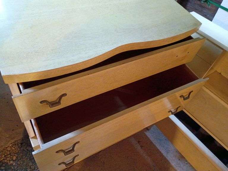 Stored in a barn. Some handles are missing. Chest of drawers is 32 inches wide. Headboard is 56 inches wide. As pictured.