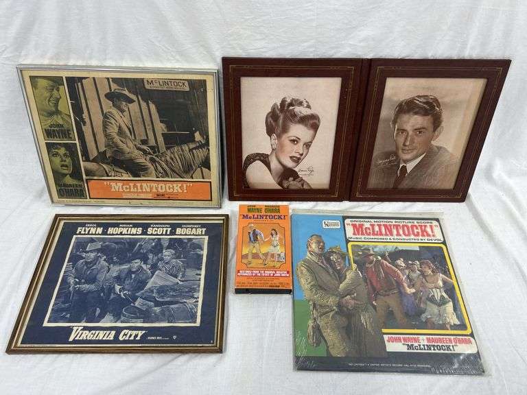 Record album appears unplayed. A Small McLintock lobby card has some staple holes and very slight moisture damage. Large framed poster has some creases and other handling wear. The framed poster measures 30 inches by 24 inches. The Virginia City lobby card looks decent. As pictured.