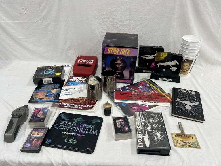 LOT 148 - Box of Star Trek Collector Items - Collector Cards, Notepad, Mouse Pad, Plastic Cups, Book, & More