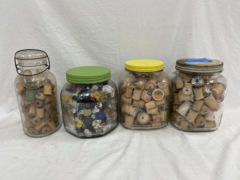 LOT 138 - Four Old Jars with Wooden Thread Spools & Buttons