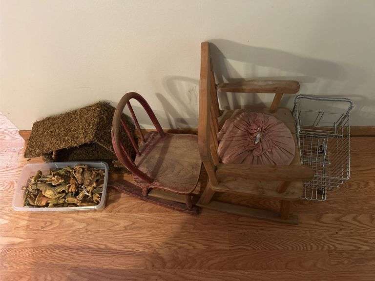 LOT 308 - Nativity Set, Child / Doll Rocking Chairs, Small Shopping Cart, & Chamber Pot Lid