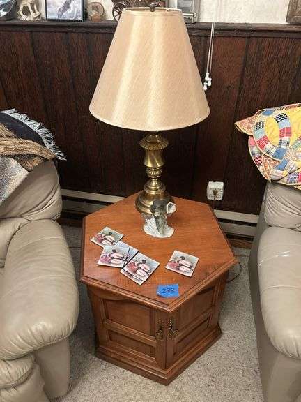 LOT 283 - Hexagonal End Table, Lamp, Coasters, & Contents