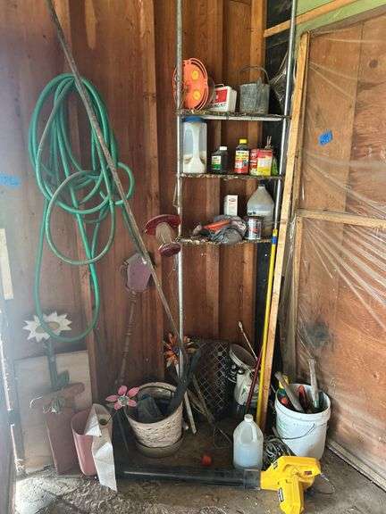LOT 134 - Items in Corner - Hummingbird Feeder, Gardening Stuff, Hose, Leaf Blower, & More