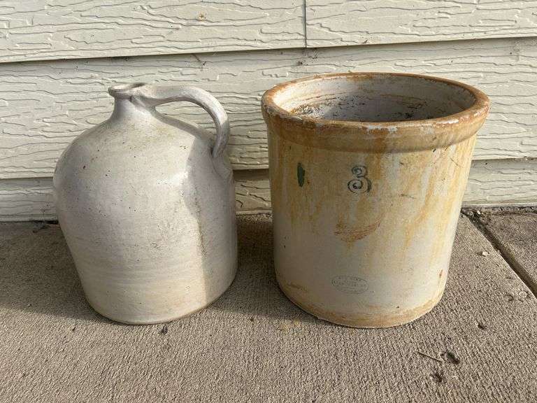 Three gallon piece has a chip on the lip and one at the bottom, there are not any cracks. The jug has a crack at the bottom. As pictured.