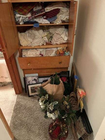 LOT 438 - Closet Contents & More - Decor, Wall Hangings, Doilies, Table Coverings