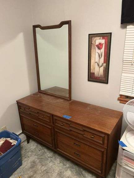 Mirror is removable. Dimensions are 18 inches deep, 54 inches wide, and 30 inches high. The mirror is 40 inches tall by 27 inches wide. As pictured. The style of this piece matches Lot 425.