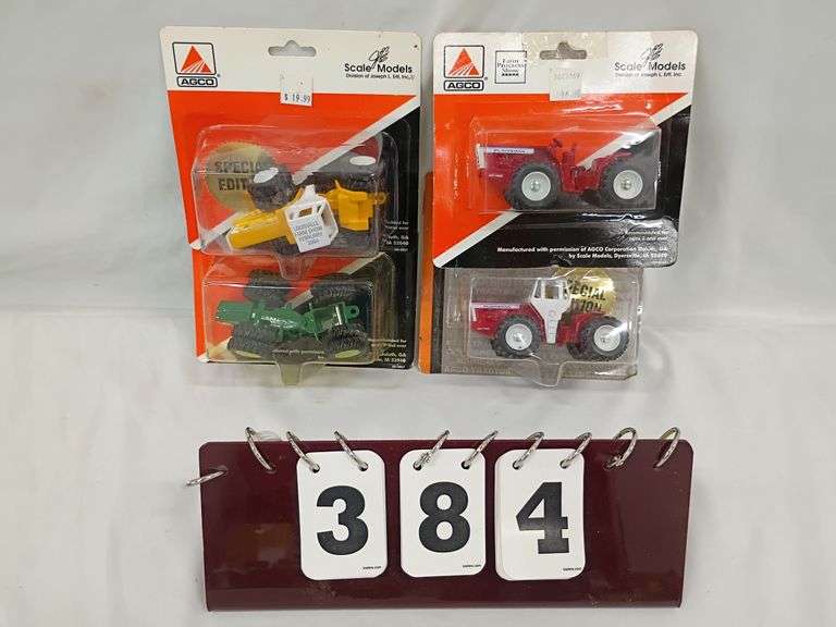Group of four tractors. White Plainsman from the 2000 Farm Progress Show, Minneapolis Moline from the 2004 Louisville farm show, White Plainsman with cab from the 2005 Louisville Farm Show, Oliver 2002 collector's edition. Packaging shows wear. As pictured.