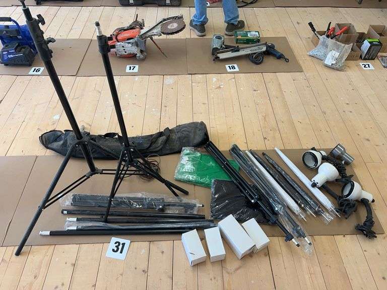 Camera & light stands. Includes four stands, two backdrop sheets, four light umbrellas, numerous lights and cords. As pictured.